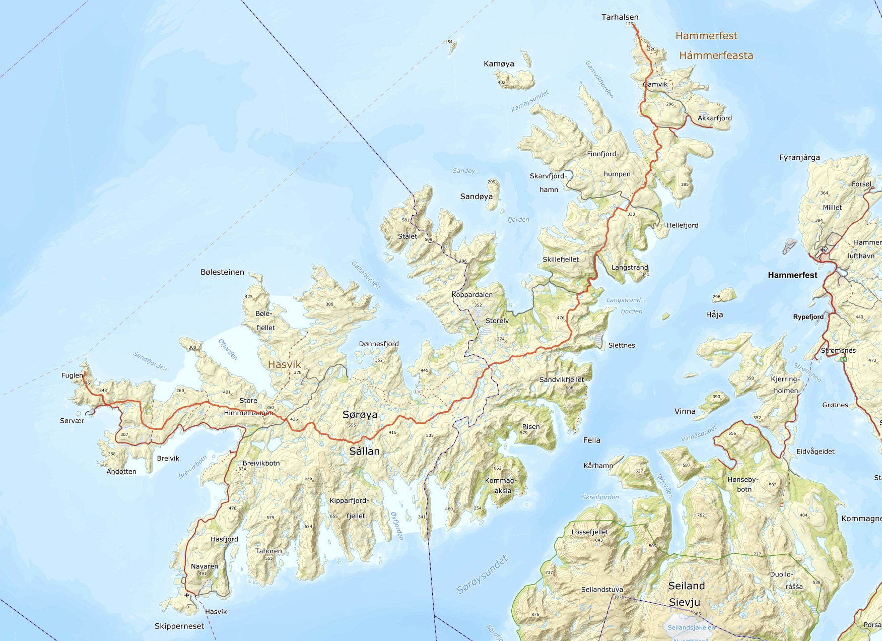 Sørøya (or Sørøy Island) is located in Finnmark, at the very northern tip of Norway and Europe, 350 kilometers (about 217 miles) north of the Arctic Circle. A 95-kilometer (about 59-mile) hiking route stretches across the entire island, from Fuglen in the southwest to Tarhalsen in the north. Sørøya sits at 70.4 degrees North latitude …